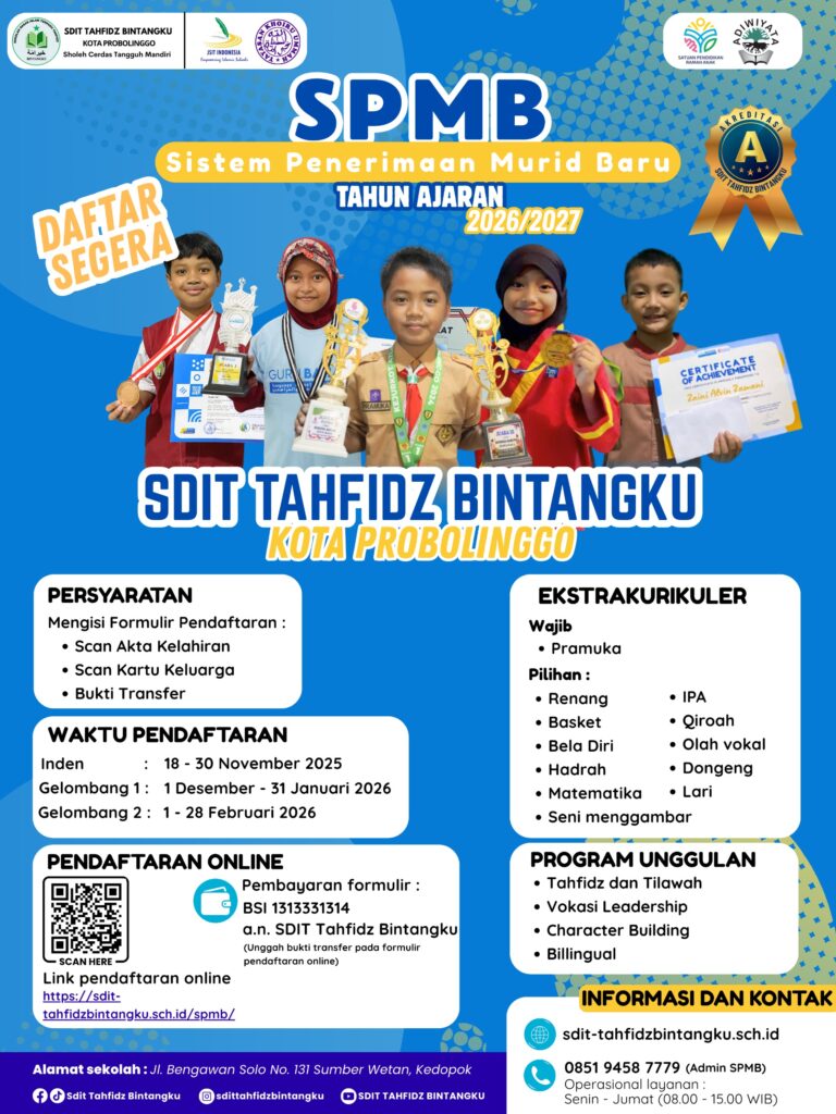 SDIT Tahfidz Bintangku adalah sekolah dasar Islam terpadu yang berkomitmen mencetak generasi Qurani, cerdas, dan berakhlak mulia. Mengintegrasikan Kurikulum Nasional dengan program unggulan tahfidz Al-Qur’an, sekolah ini menjadi tempat terbaik bagi anak-anak untuk tumbuh menjadi pribadi beriman, berilmu, dan berkarakter.